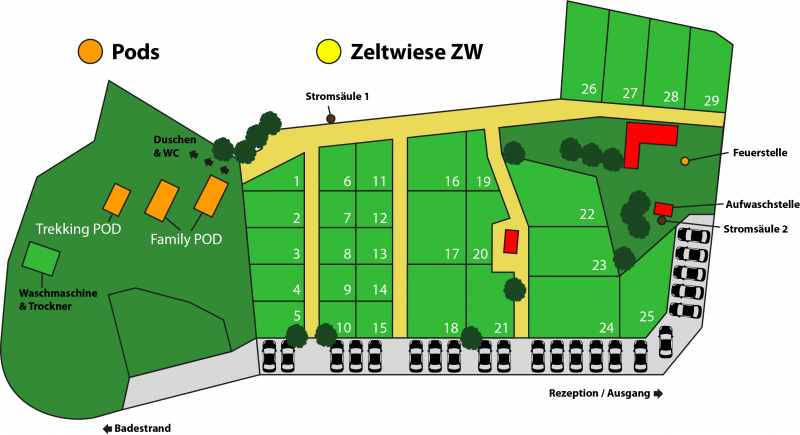 - Bei Anreise außerhalb der Service-Zeiten, wird Ihre RFID-Karte für Duschen/WC/Müll in einem der Schlüsselkästen bereitgestellt. Weitere Hinweise erhalten Sie mit der Reservierungsbestätigung oder Anreiseinformation.